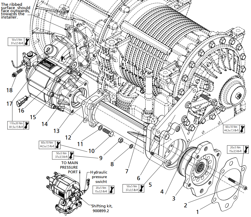 Fit the PTO (13) with the screws (18), tighter the screw in accordance with the torque shown.