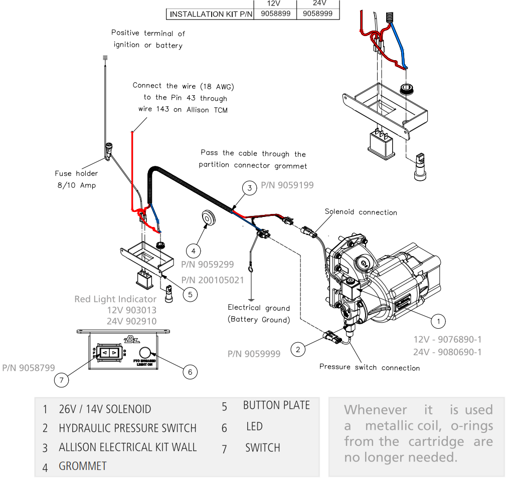 Allison Gen 6: To hardwire PTO, Contact vehicle dealer with vehicle vin number and get correct transmission/TCM build code and wire connections in order to get maximum PTO pressure (225 psi, 15.5 bar) from transmission to avoid damage to Bezares PTO and Allison transmission. Failure to do so would result in the voiding warranty of the Bezares PTO