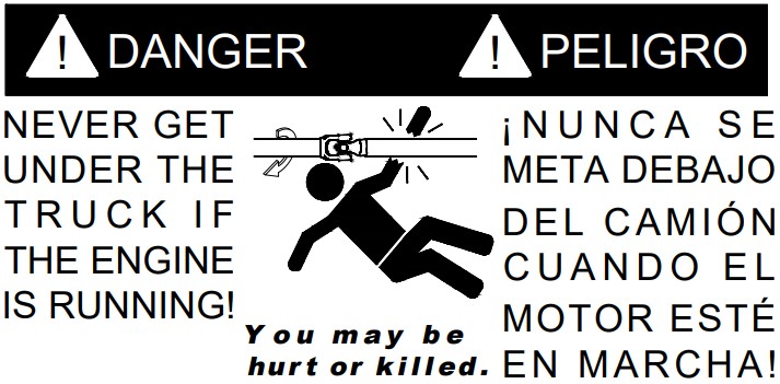 - DO NOT operate the controls of the Power Take-Off or other driven equipment from underneath the vehicle with the engine running.