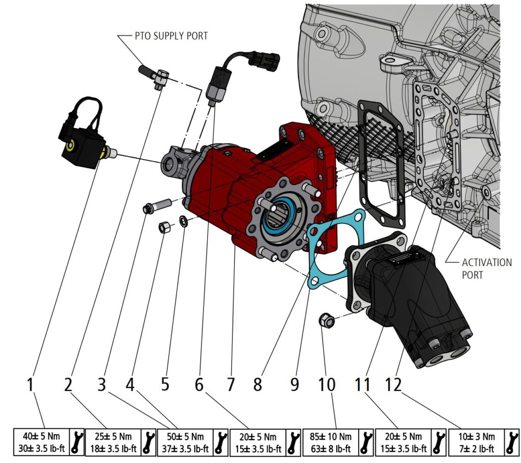 step 8: Mount PTO using the six cap screws plus 2 washers and nuts on step studs. Torque to 28 lb. ft.