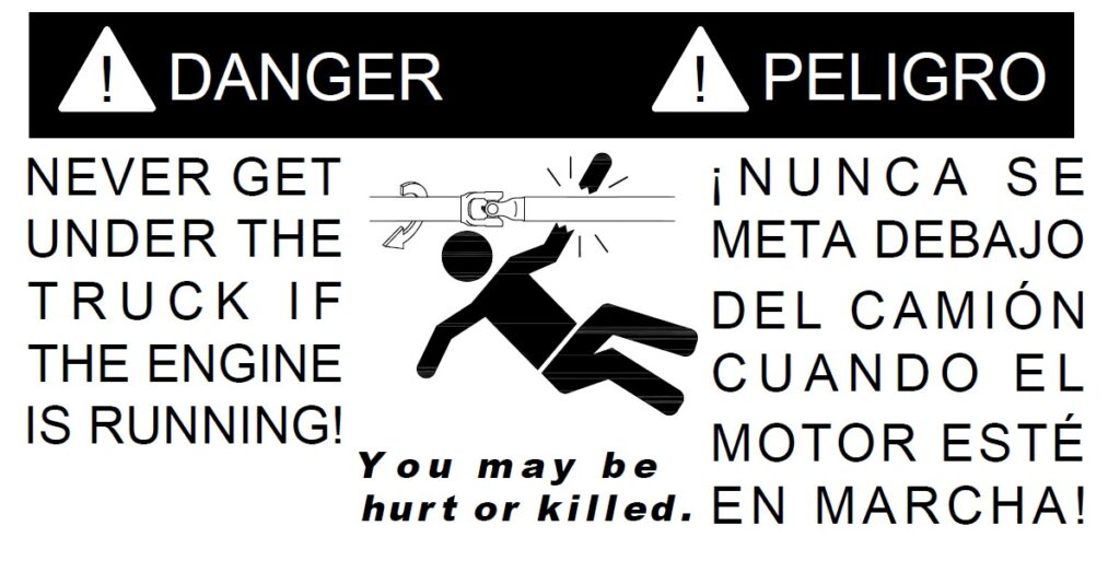 STOP ENGINE-Never go under truck with engine running!